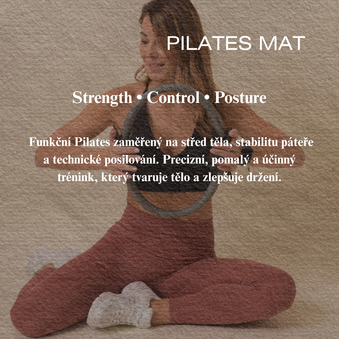Pilates Mat posiluje hluboký stabilizační systém, zlepšuje držení těla, propojuje dech s pohybem a pomáhá vytvořit silné a stabilní tělo bez bolesti.
